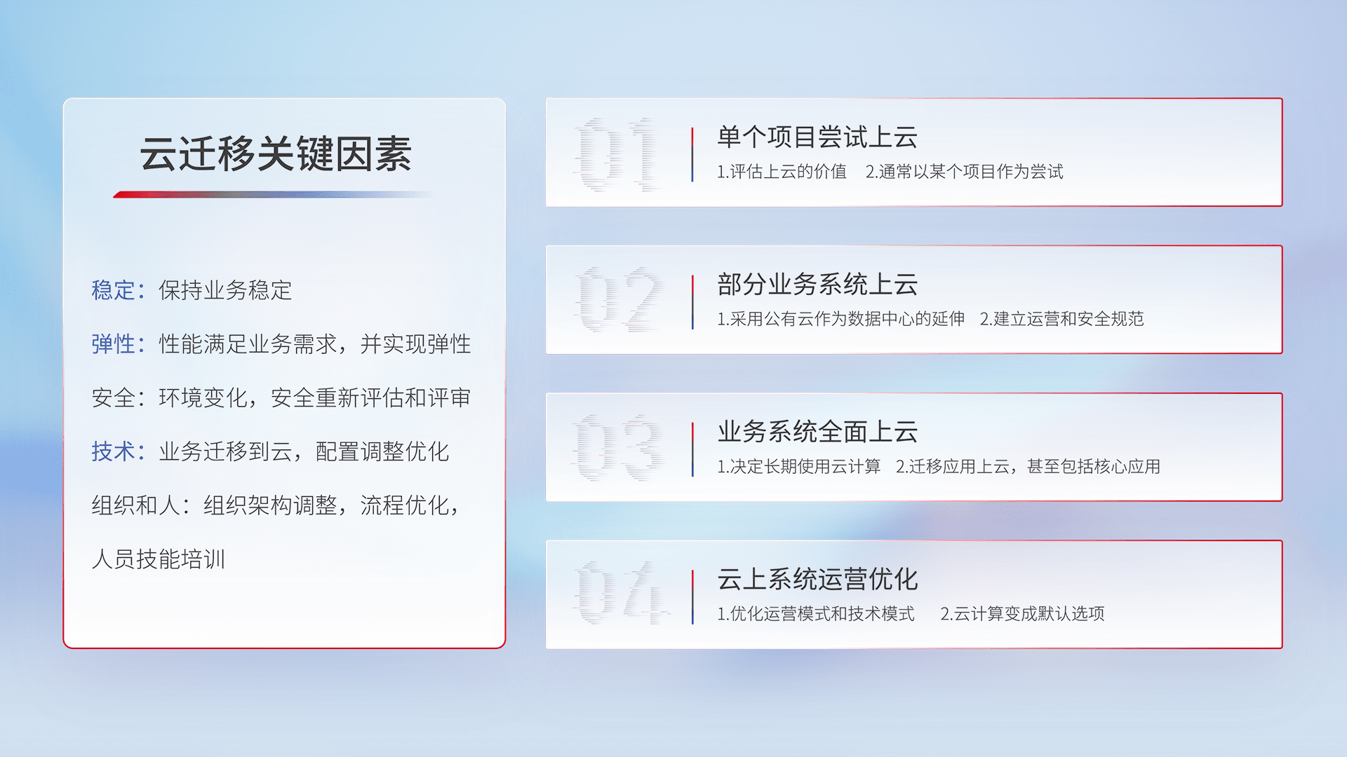结合实际业务,,从规划设计、、、、云平台选型、、、、云原生改造、、、、数据迁移、、、集成交付,,,,迁移全过程为客户识别最佳上云路径,,做好风险识别管理,,,,设计网络架构、、、身份权限、、、、安全审计合规、、、操作审计、、、日志审计、、、、监控告警策略、、多站点容灾设计等,,,,对云上基础设施进行整体规划,,,提升IT治理水平,,以满足弹性、、、、高可用、、、高性能的需求。。。。