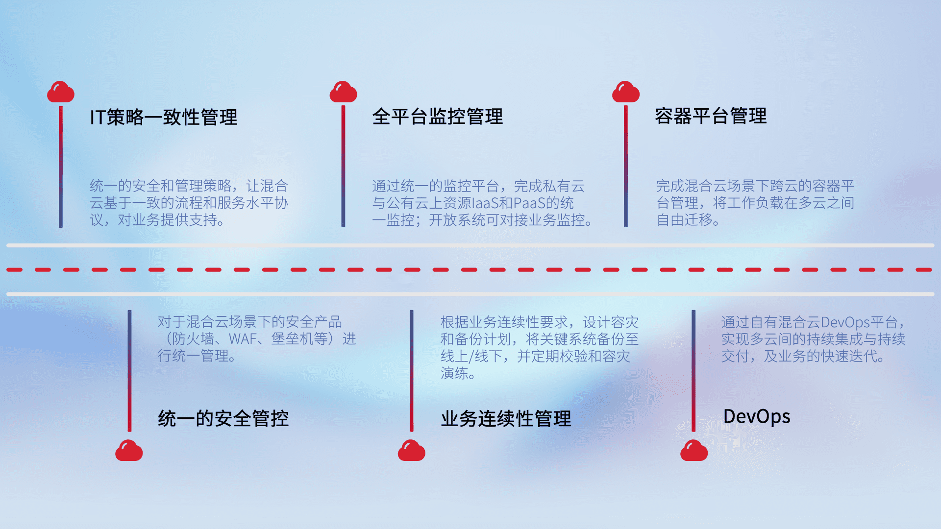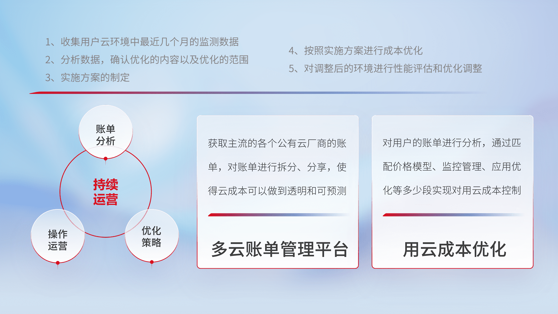 通过多云纳管,,,以统一的资源数据模型把客户的云资源进行抽象和封装,,,进而实现对多云资源的统一操作,,保障云资源管理的可靠性、、、稳定性与可用性。。量身定制化运维内容,,配置、、开发运维、、、补丁管理、、、备份、、、、监控、、、、认证和访问管理、、、、审计和日常巡检等,,,保障在用云过程中的可靠度,,,稳定度以及高可用率。。。